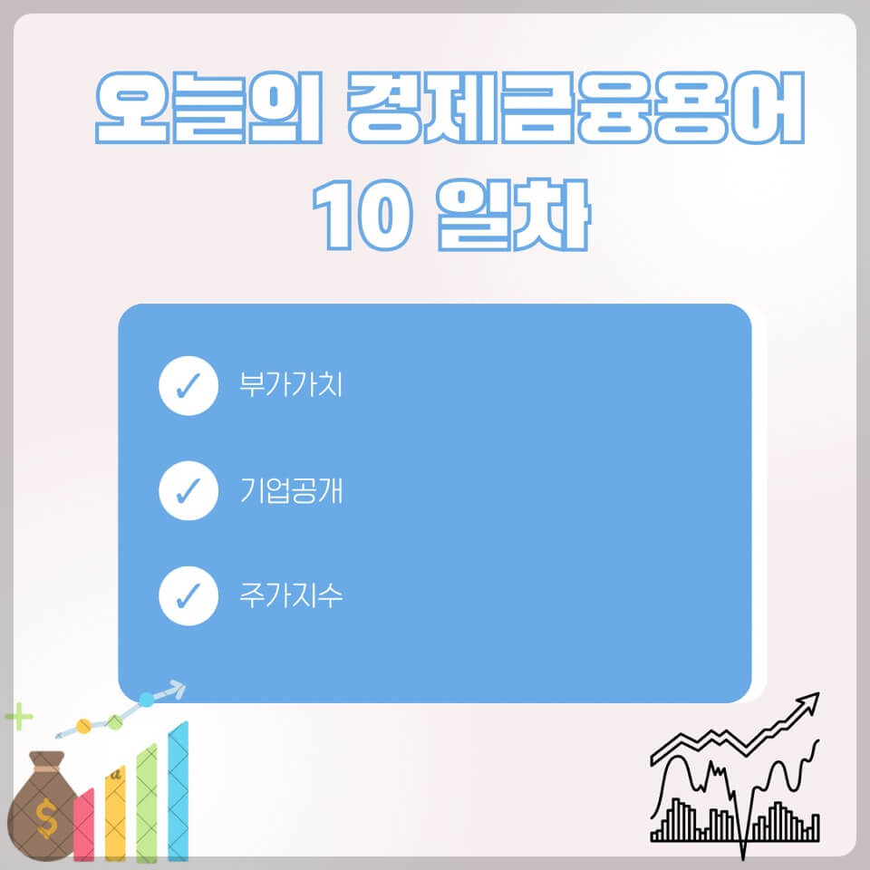 경제금융 용어 공부 90선_10일 차인 오늘은 '부가가치, 기업공개, 주가지수'를 알아보겠습니다. 주말인 오늘도 경제금융 용어가 쉽게 들리는 그날까지 자주 접해보아요.