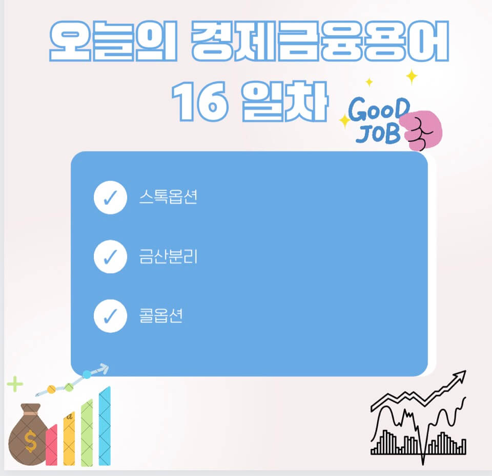 경제금융 용어 공부 90선_16일 차인 즐거운 토요일에 '스톡옵션, 금산분리, 콜옵션'에 관해서 알아보겠습니다.