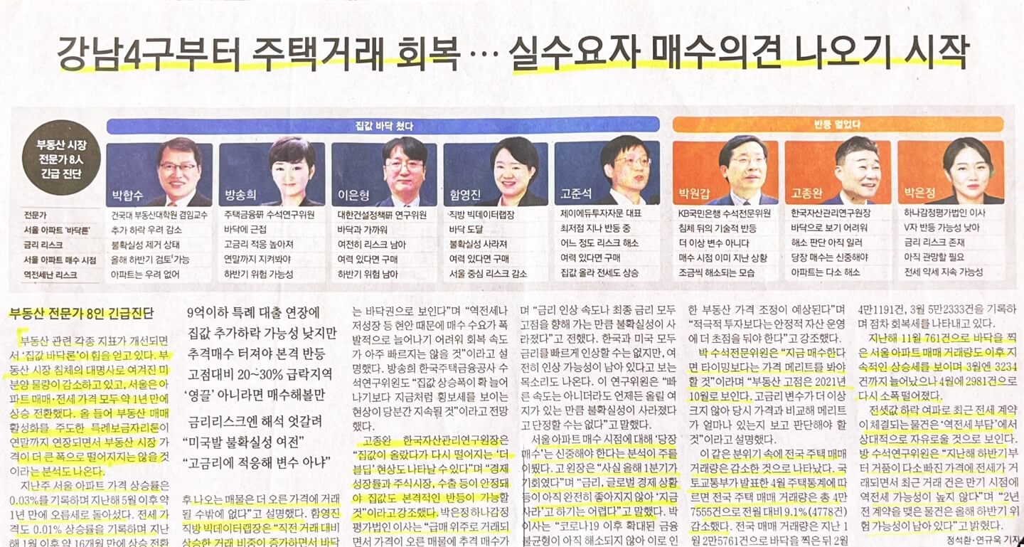 고종완 한국자산관리연구원장은 "사실 올해 1분기가 기회였다"며 "금리, 글로벌 경제 상황 등이 아직 완전히 좋아지지 않아 '지금 집을 사라'라고 하기는 어렵다"라고 말했다. 박이사는 "코로나19 이후 확대된 금융 불균형이 아직 해소되지 않아 이로 인한 부동산 가격 조정이 예상된다"며 "적극적 투자보다는 안정적 자산운영에 더 초점을 둬야 한다"라고 강조했다.