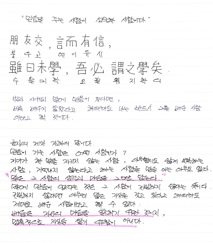 논어필사_6일째 '믿음을 주는 사람이 성숙한 사람이다'는 공자 제자 자하의 말이다. 말은 그 사람의 생각과 마음을 그대로 담고 배움은 지식을 쌓기 위함과 더불어 자신의 마음을 밝히기 위한 것이다.