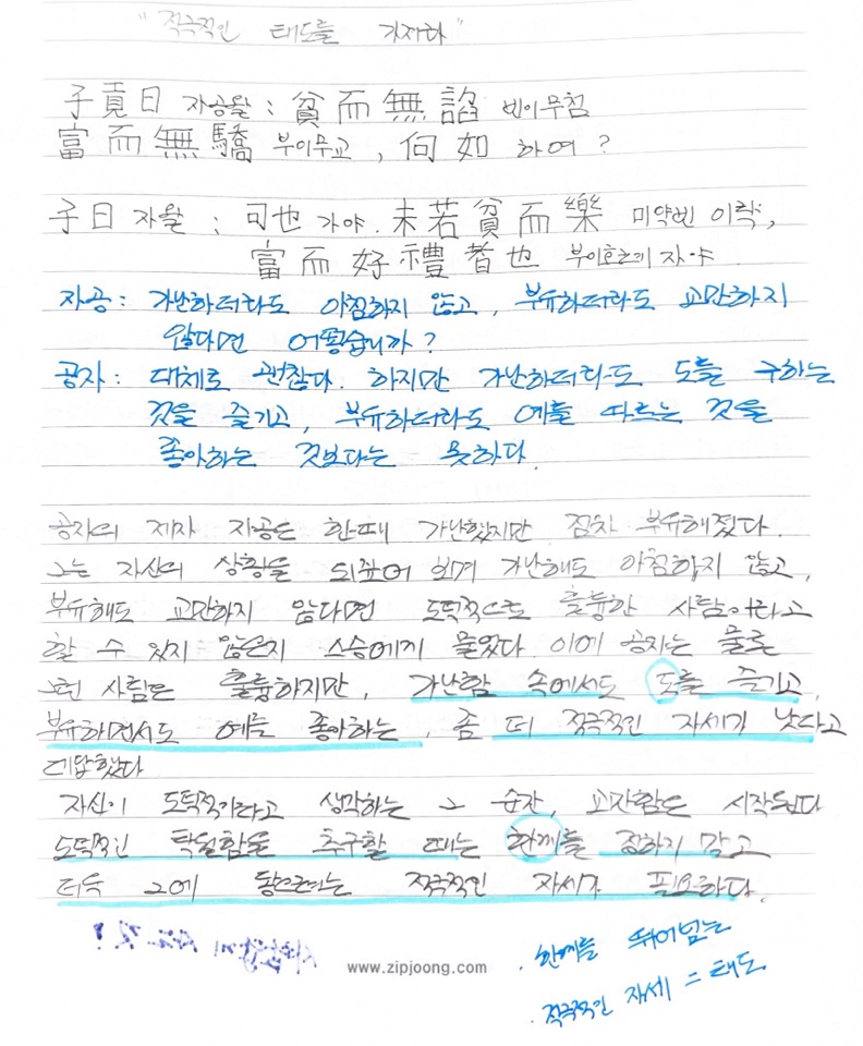 가난함 속에서 도를 즐기고 부유하면서도 예를 좋아하는 좀 더 적극적인 자세가 낫다고 공자는 말한다. 논어 필사_10일째 '적극적인 태도를 가져라'는 자신이 도덕적이라고 생각하는 순간 교만함이 시작될 수 있기 때문에 도덕적인 탁월함을 추구할 때는 한계를 짓지 말고, 적극적인 자세가 필요하다고 말하고 있다.