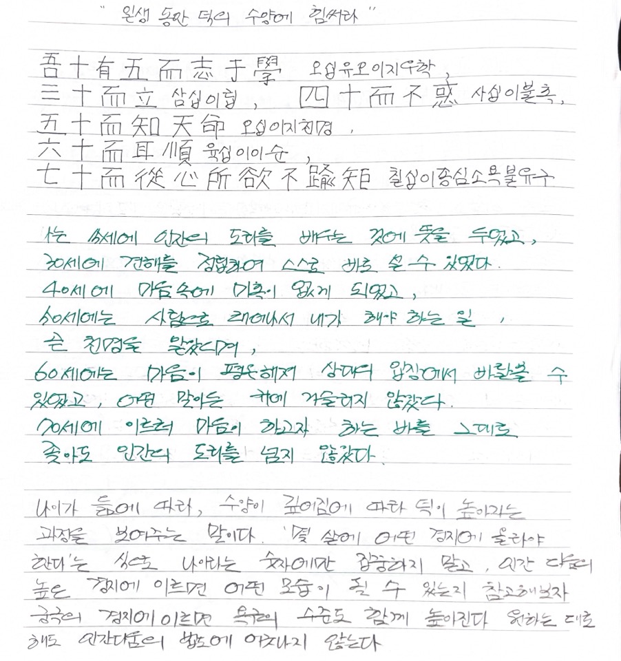 논어 필사_14일째 '일생 동안 덕의 수양에 힘써라'는 나이가 듦에 따라 수양이 깊어지면서 덕이 높아지는 과정을 보여주는 말로 궁극의 경지에 이르면 욕구의 수준도 함께 높아지며 원하는 대로 해도 인간다움의 법도에 어긋나지 않는다는 말씀입니다.