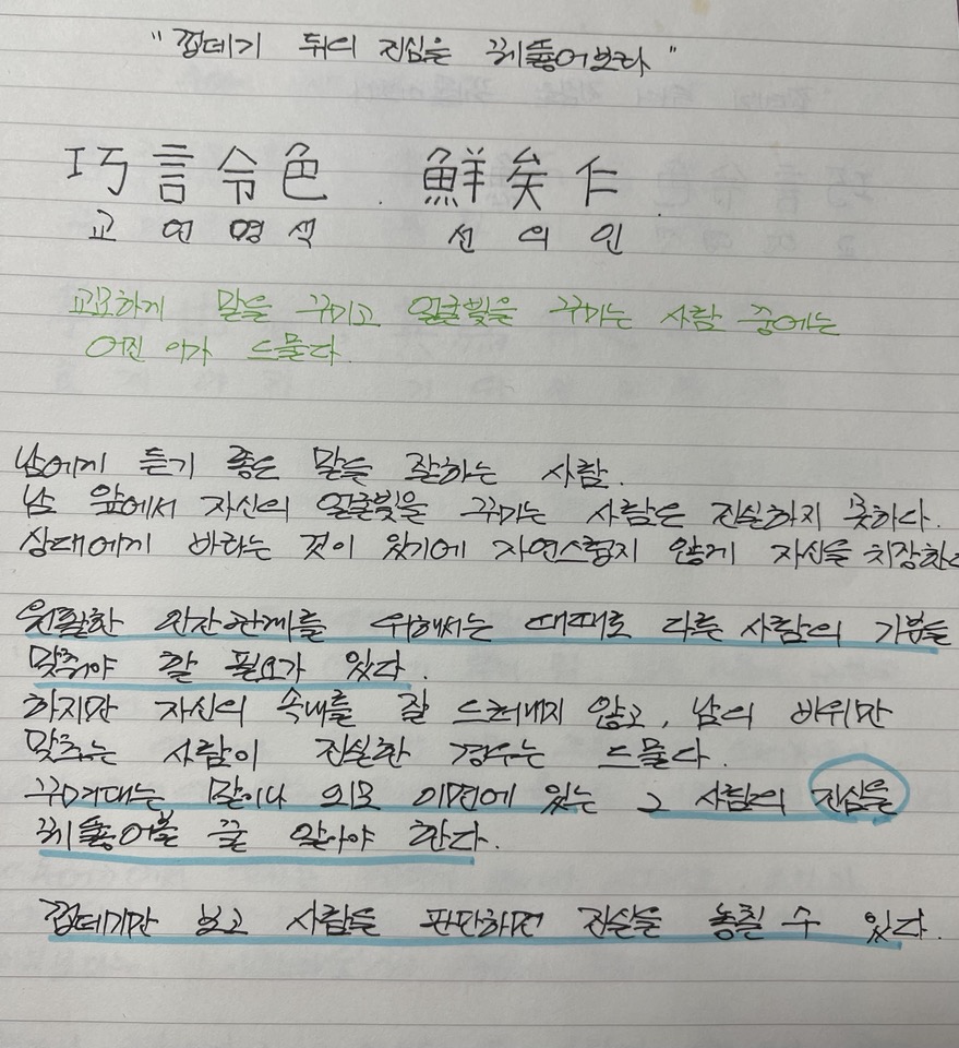논어 필사_3일째 '껍데기 뒤의 진심을 꿰뚫어 보라'로 학이편 3장으로 꾸며대는 말이나 외모 이면에 있는 그 사람의 진심을 볼 줄 알아야 한다는 의미로 겉모습으로 사람을 판단하면 진실을 놓칠 수 있다는 뜻이다.