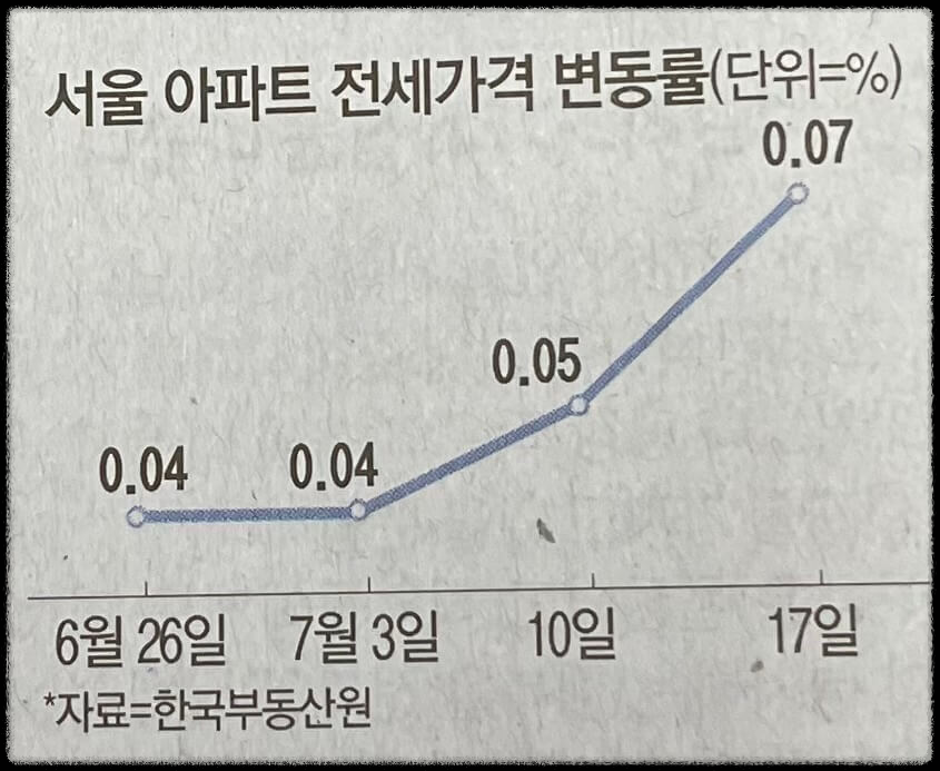 20일 한국부동산원 주간 가격 동향 조사에 따르면 이달 셋째 주 서울 아파트 전세 가격은 0.07 상승했으며 전주 상승률인 0.05% 대비 0.2% 상승 폭이 확대되었다. -매일경제신문-