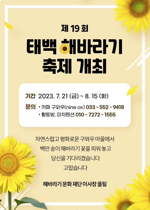 여름 무덥지만 더위도 물리칠 태백 여름 축제 2곳을 소개합니다. 첫 번째는 태백 해바라기 축제와 두 번째 태백 선선 페스티벌에서 멋진 2023년 여름을 추억 여행을 만들어보시면 어떨까요?