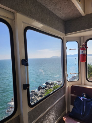 저는 먼저 미포 정거장에서 스카이캡슐을 타고 청사포 정거장에서 하차하여 구경하다가 청사포 정거장에서 해변열차를 타고 끝인 송정 정거장에서 하차하여 여유를 즐기다가 다릿돌 전망대로 출발, 하차하여 짜릿함을 즐겼습니다.